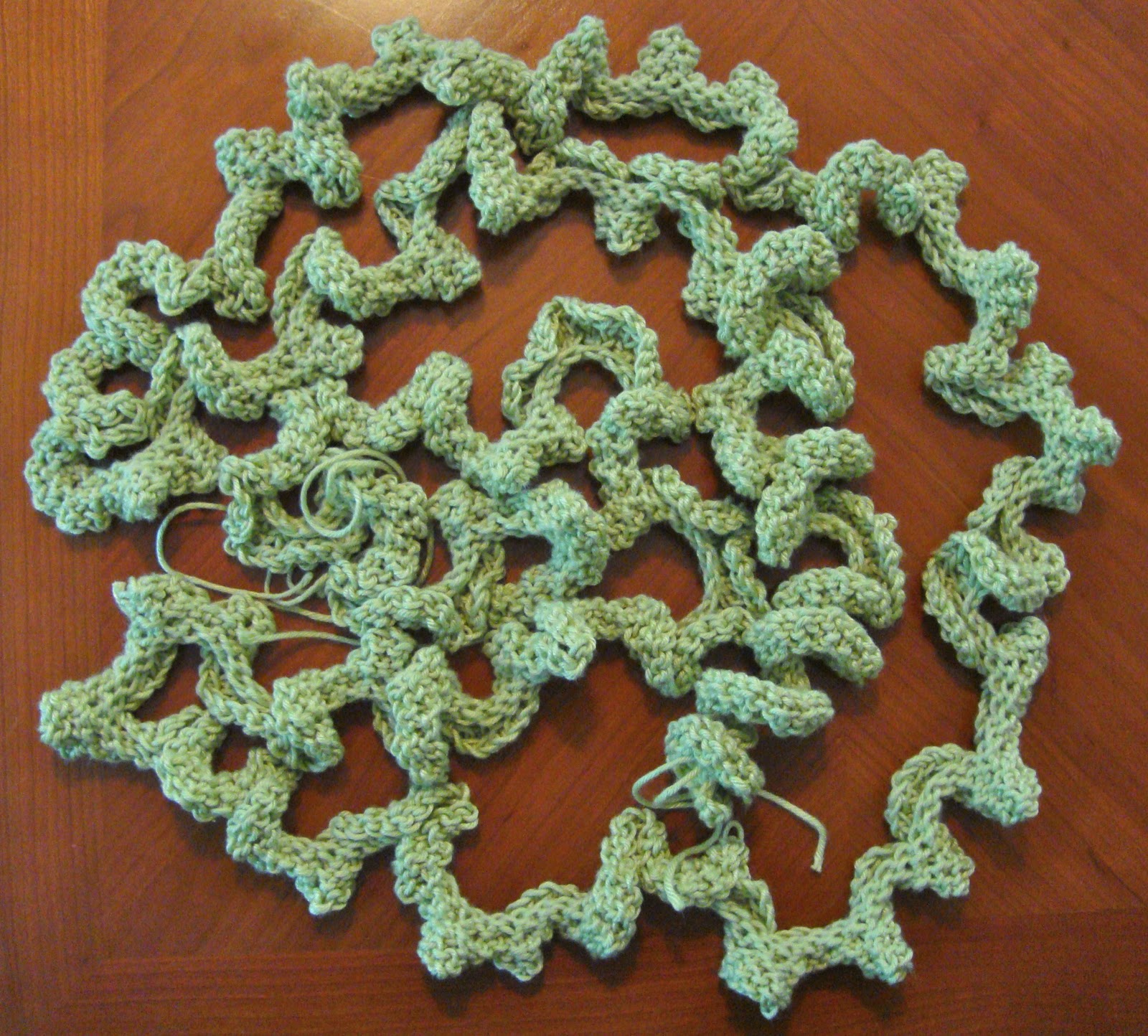 It spiraled pretty nicely for about the first 50 or so stitches bound off, but then it started forming something more like V-shapes rather than spirals. I probably should have used a bulkier weight yarn, but I'm hoping I can change the pattern somehow to make it look better. I'm going to take it to my LYS tomorrow. I'm guessing there's definitely going to be some frogging involved :( especially since it ended up being about 10 feet long instead of the 5.5 feet in the original pattern. I'm thinking I need to start over and use the prescribed number of cast-on stitches and maybe increase the number of rows to make it more bulky so it will curve instead of bending into a sharp angle. I haven't tried knitting the flowers yet, but they are made from the same pattern with fewer stitches cast on.